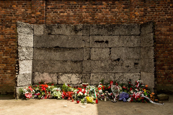 A pile of flowers lay beneath the 'death wall' inside the Auschwitz-Birkenau Memorial and Museum.