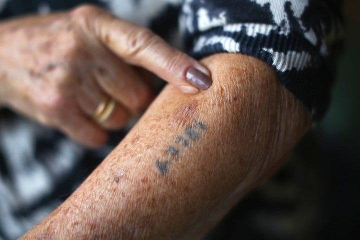 Auschwitz and Belsen concentration camp survivor Eva Behar shows her prisoner number that was tattooed on her arm by her Nazi captors.