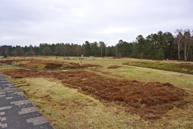 Raised mounds marking some of the 13 mass graves at the site of the former Bergen-Belsen concentration camp in Lower Saxony, Germany.