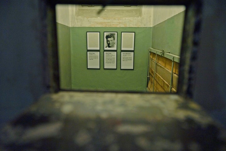 Victim memorials in a cell at the Buchenwald concentration camp near Weimar, Germany. The victims are named as Michael Zajac (1908–1941), Albert Kuntz (1896–1945) and Julius Silbermann (1905–1938).
