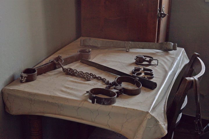 Manacles and leg irons on display at the Buchenwald concentration camp near Weimar, Germany.